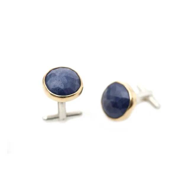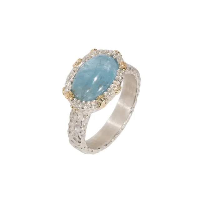 Ring double dots gemaakt van zilver en 18kt geelgoud met een aquamarijn cabochon