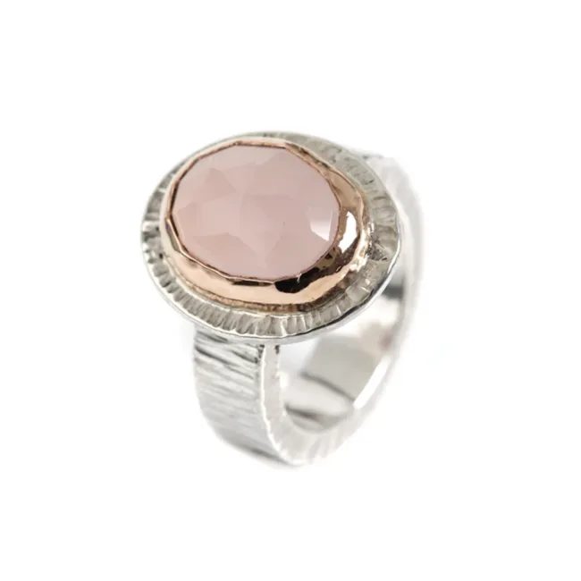 Plisséring gemaakt van zilver en 18kt roodgoud met een roze calchedoon