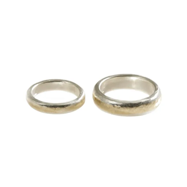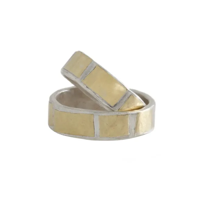 Baksteentjes trouwringen gemaakt van zilver en 18kt geelgoud