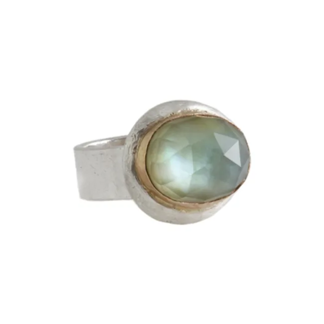 Plakring gemaakt van zilver en 18kt geelgoud met een synthetische groene kwarts op parelmoer