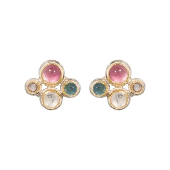 Oorstekers gemaakt van zilver en 18kt geelgoud met een groene en een roze toermalijn, een maansteen en een diamant