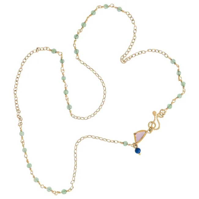 Collier van 14kt geelgoud, aventurijnbolletjes geketteld in 18kt geelgoud, 18kt geelgouden slot,een roze saffier gezet in 18kt geelgoud en een kraal van lapis lazuli