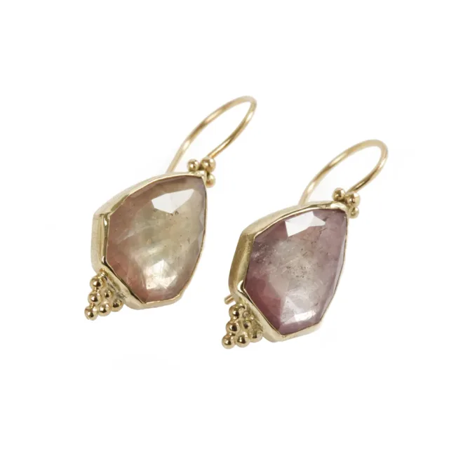 Oorsieraden roze korund gezet in 18kt geelgouden zetting en gouden granules