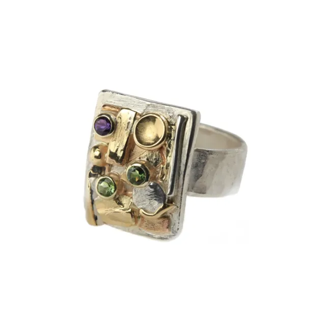 Rechthoekige ring gemaakt van zilver en 18kt roodgoud en geelgoud, met twee tsavorieten en een amethyst