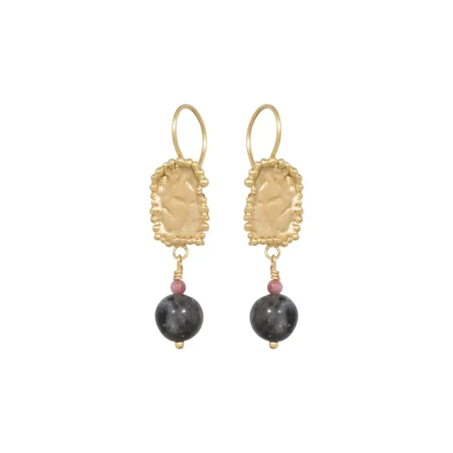 Oorbellen ‘sprinkles’ gemaakt van 18kt geelgoud en een zwarte labradoriet en een toermalijn bolletje