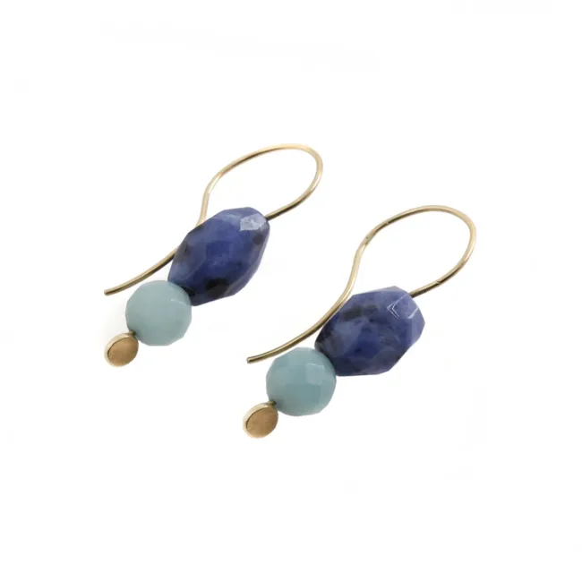 Oorsieraden gemaakt van 18kt geelgoud met dumortiriet en amazoniet