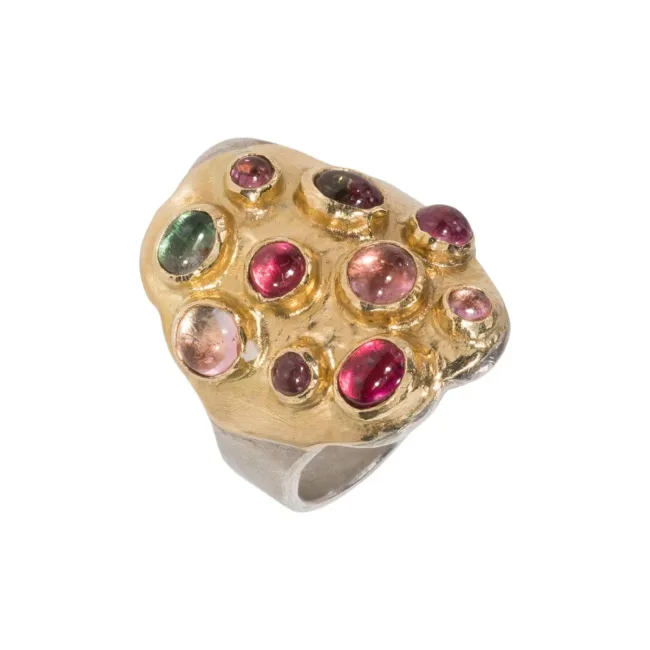 Ring bubblelicious gemaakt van zilver, 18kt geelgoud en 10 tourmalijnen