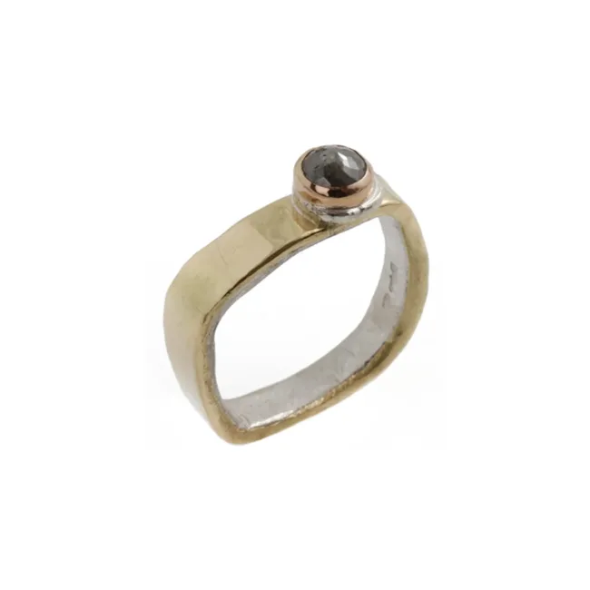 Vierkante ring gemaakt van 18kt geelgoud gesmeed op zilver met een roosgeslepen diamant