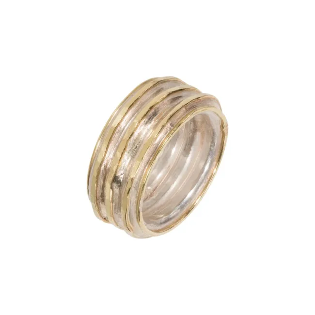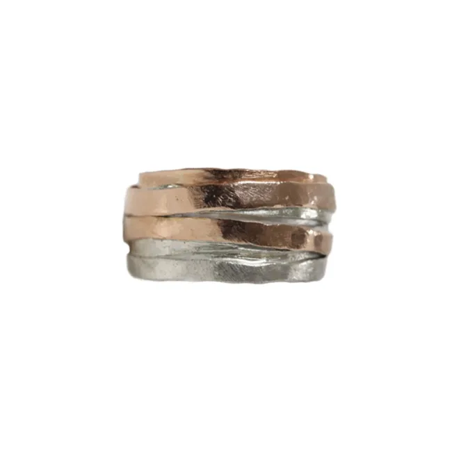 Pannenkoekring gemaakt van drie zilveren ringen met 18kt roodgouden bandjes eromheen