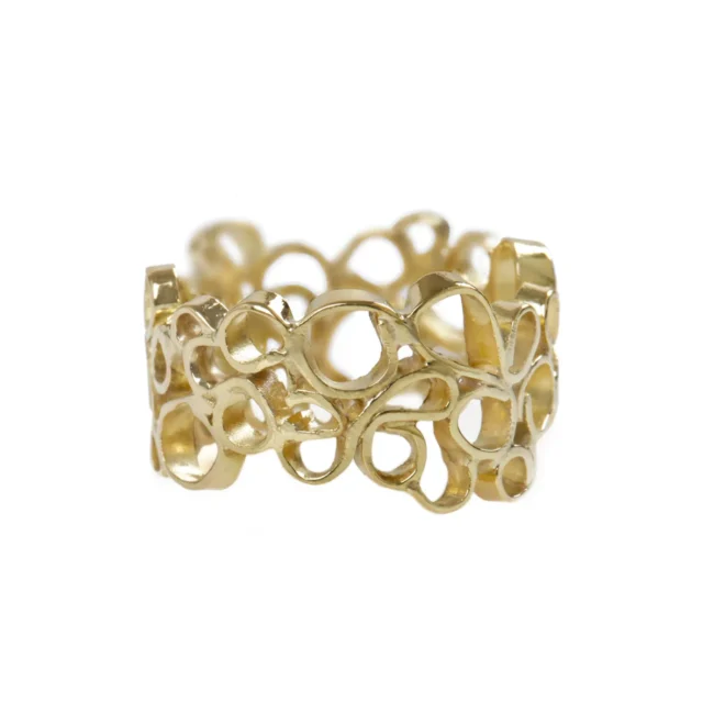 Soesjesring, een ring van zilver met 18kt roodgouden en geelgouden bolletjes in een gouden zetkast