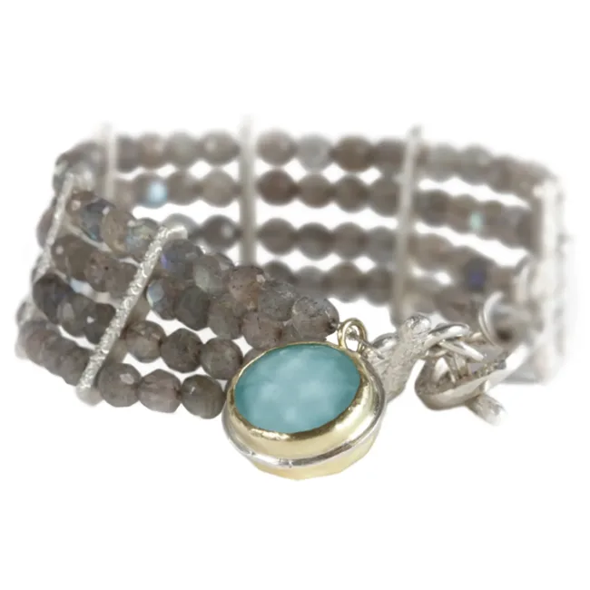 Armband met labradorietkralen, zilver en een berkristal op turkoise gezet in 18kt geelgoud