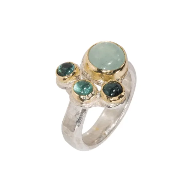 Ring gemaakt van zilver en drie toermalijnen en een aquamarijn gezet in 18kt geelgoud