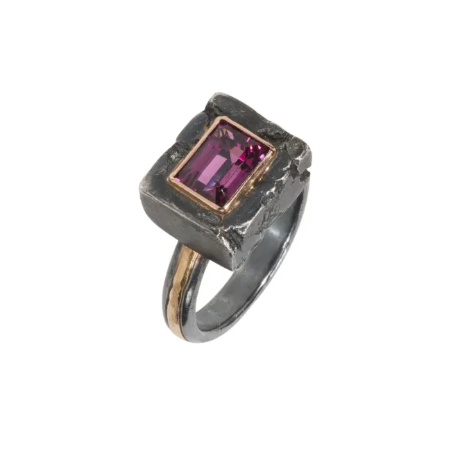 Block of Rock ring gemaakt van zilver en 18kt roodgoud met een rhodolietgranaat