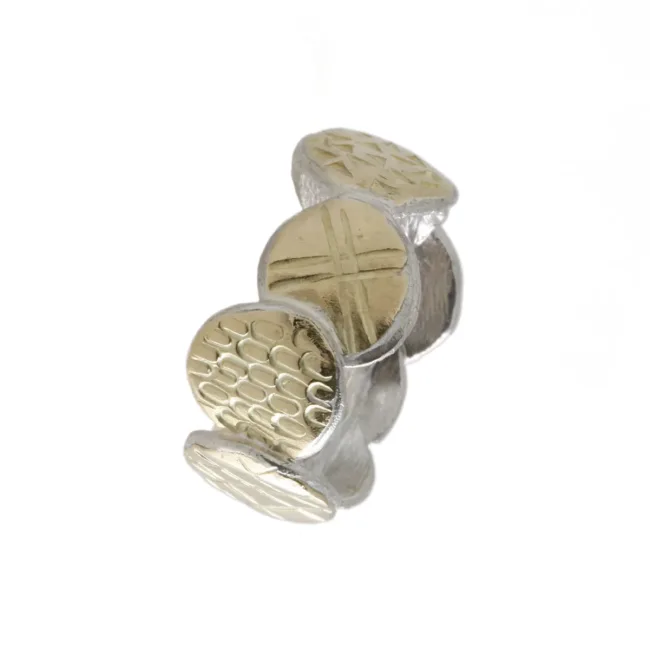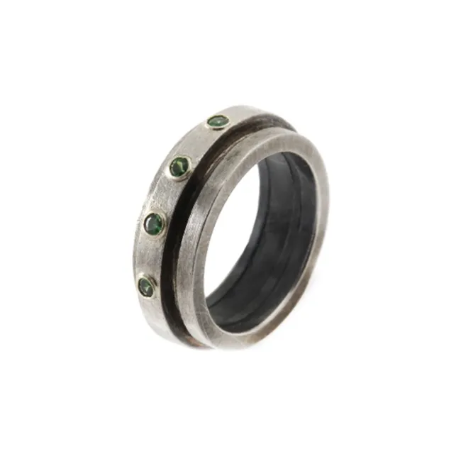 Plumberring gemaakt van geoxideerd zilver met tsavoriet gezet in geelgoud 18kt