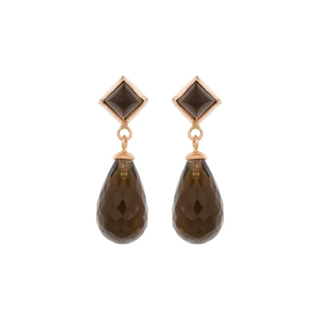 Oorsieraden met een vierkante rookkwarts gezet in 18kt roodgoud en een rookkwarts druppel