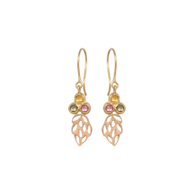 Strawberry fields forever, oorhaken gemaakt van 18kt roodgoud en geelgoud met een roze, een groene en een gele korund