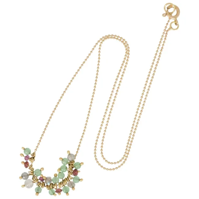Bolletjescollier van 14kt geelgoud met labradoriet, maansteen, aventurijn, rhodoliet aan 18kt geelgoud